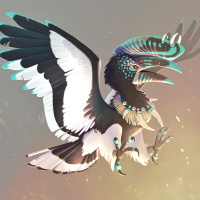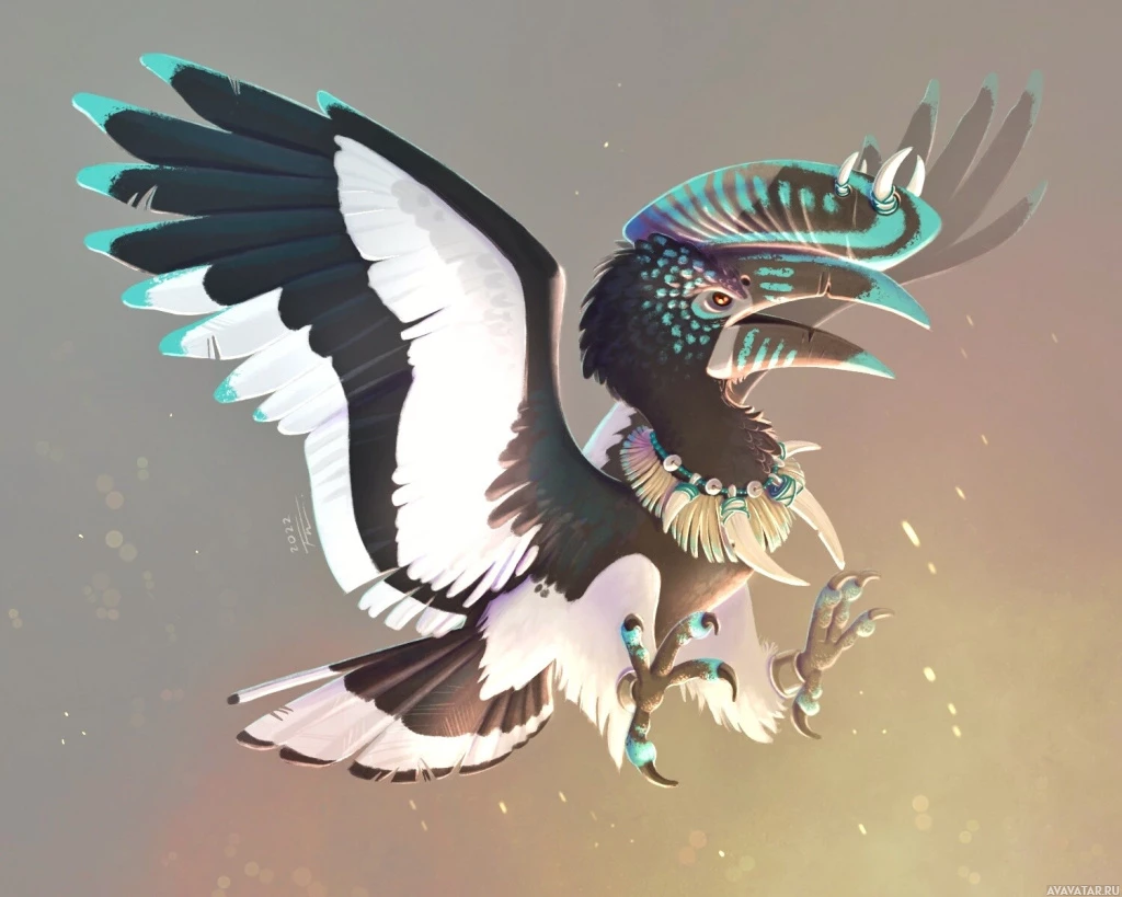 large wings and beak. It is depicted with exaggerated features such as