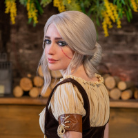 The image shows a person dressed in costume that appears to be inspired by the character Ciri from "The Witcher" game. The individual is sitting on a chair or stool with one leg crossed over the other, wearing tight brown leather-like pants and