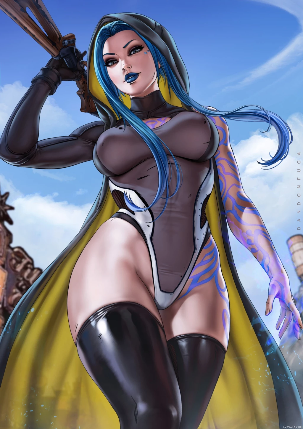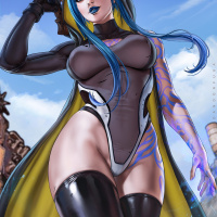 blue hair, dressed in a fantasy-style costume that includes a bodysuit and thigh-high boots. She is holding what appears to be a weapon or tool. In the background, there's another character, but they are partially obscured by the foreground character. The art style suggests this could be from