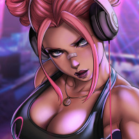 the neon lights and microphone in the background. The character is wearing a black