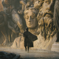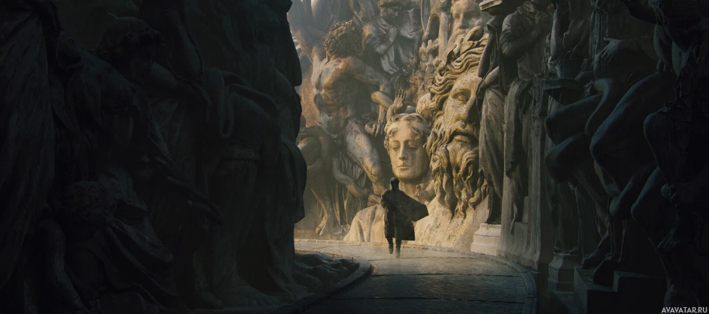 На картинке виден силуэт человека, стоящего на переднем плане. На заднем плане виден обширный горный пейзаж с возвышающимися скальными образованиями. Судя по освещению, сейчас либо рассвет, либо сумерки из-за мягкого освещения с неба. Общая атмосфера драматична и безмятежна, в ней отражается величие архитектуры природы на фоне человеческой фигуры.