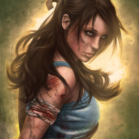 dark hair, is wearing a blue top, and is holding what appears to be a weapon in her hand. Her attire suggests she might be playing the role of Lara Croft from