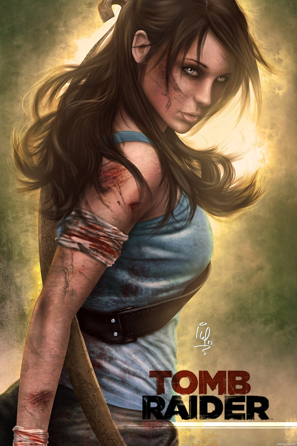the video game "Tomb Raider." In the foreground, there's stylized text that reads "TOMB RAIDER," which is presumably related to the character and