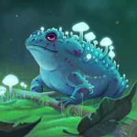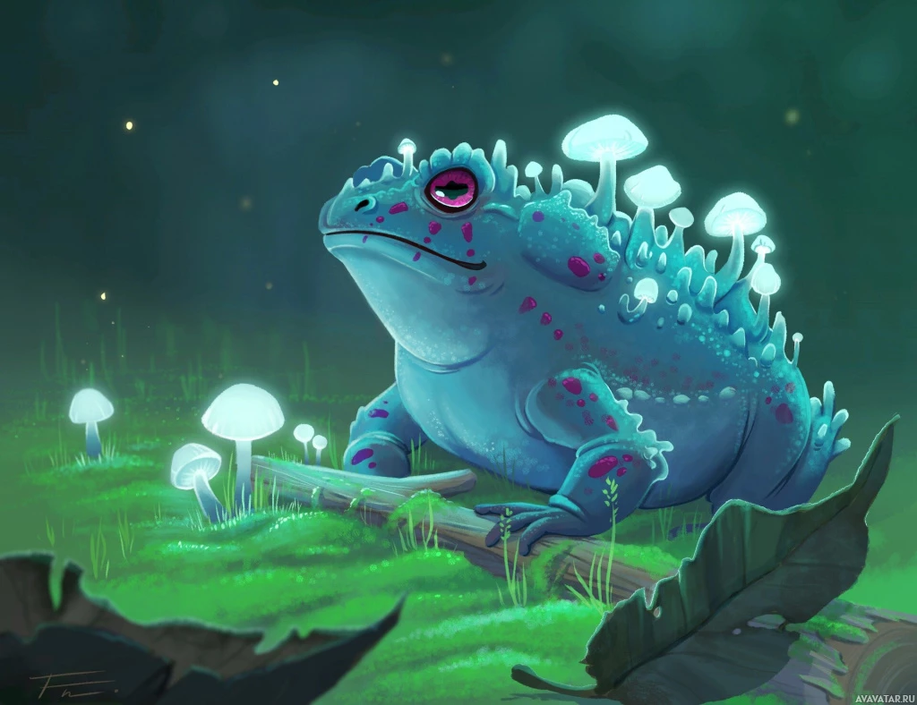 fantasy world context. This frog-like creature is sitting on what appears to be a mushroom with glowing