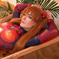 a cosplay costume that resembles Asuka Langley from the anime series "Neon Genesis Evangelion." This character is depicted sitting on