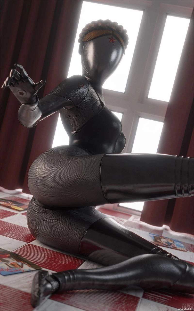 the Atomic Heart game. It appears to be sitting or kneeling on a surface with a patterned design and is wearing what looks like a leotard or