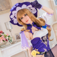 На картинке изображен человек, одетый в костюм для косплея, имитирующий персонажа Лизу из видеоигры "Genshin Impact". Костюм включает в себя фиолетовый наряд с кружевными деталями и шляпу с фиолетовыми и белыми вставками. Персонаж сидит на стопке книг, что придает косплею причудливый характер.