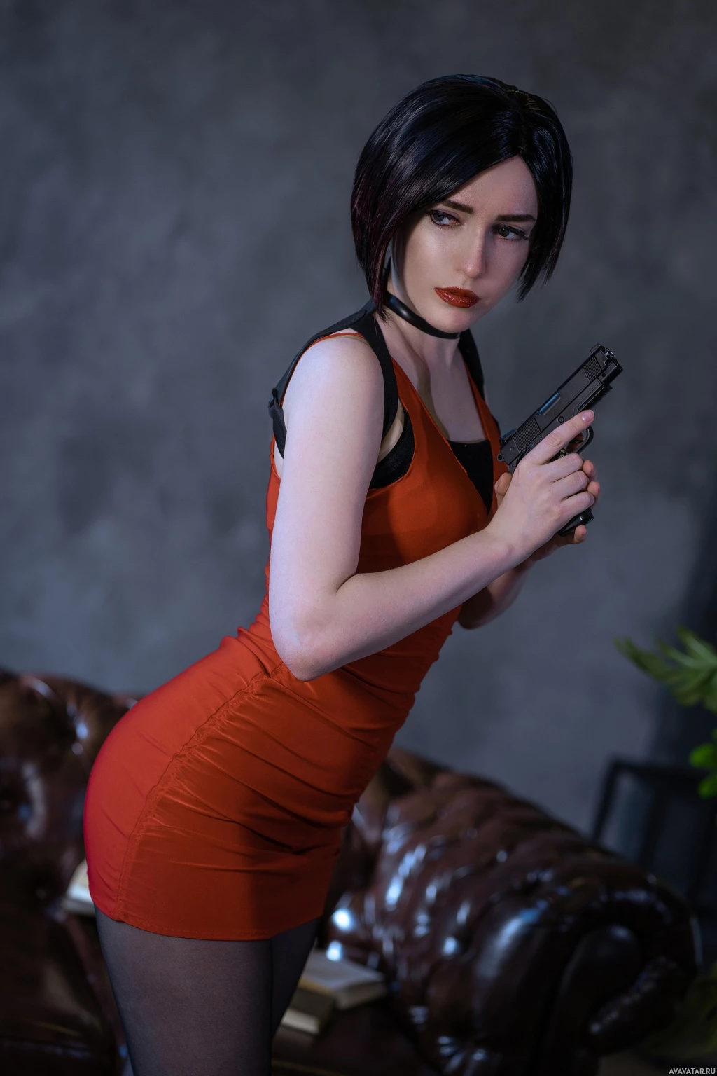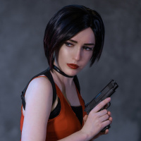 a red outfit that resembles Ada's attire and have short black hair. In their hand, they hold a pistol, which is consistent with Ada's role as an operative in