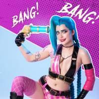 Женский косплеер в полном костюме Jinx из League of Legends Описания картинки