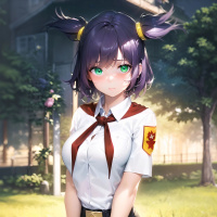 The image shows an animated character who appears to be a girl with purple hair. She has twin-tails and is wearing what looks like a school uniform, which might suggest she is a student or part of a school setting in a game or anime context. Her expression seems contemplative or concerned. There are also elements like trees and a house in the background that give the impression of a residential area.
