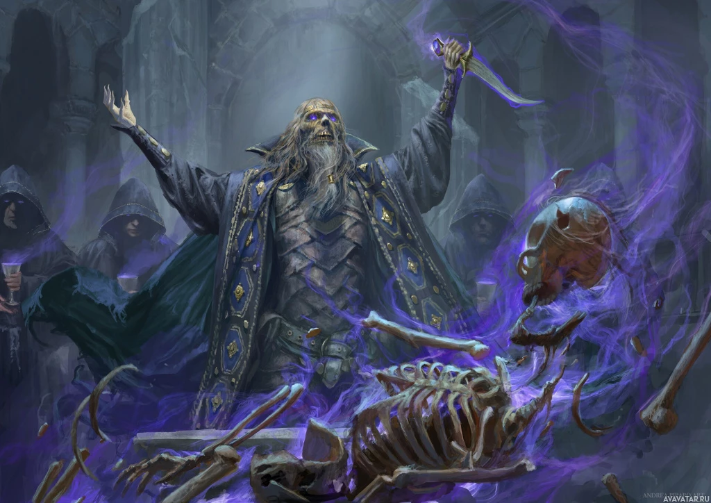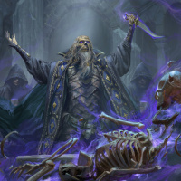 a fantasy scene where a character with a long beard, dressed in what appears to be mage robes and holding a staff or wand, is standing over a group of skeletons on the ground. The character's arms are spread wide, and they seem to be casting some