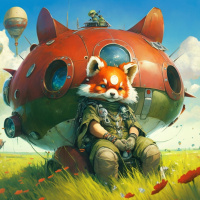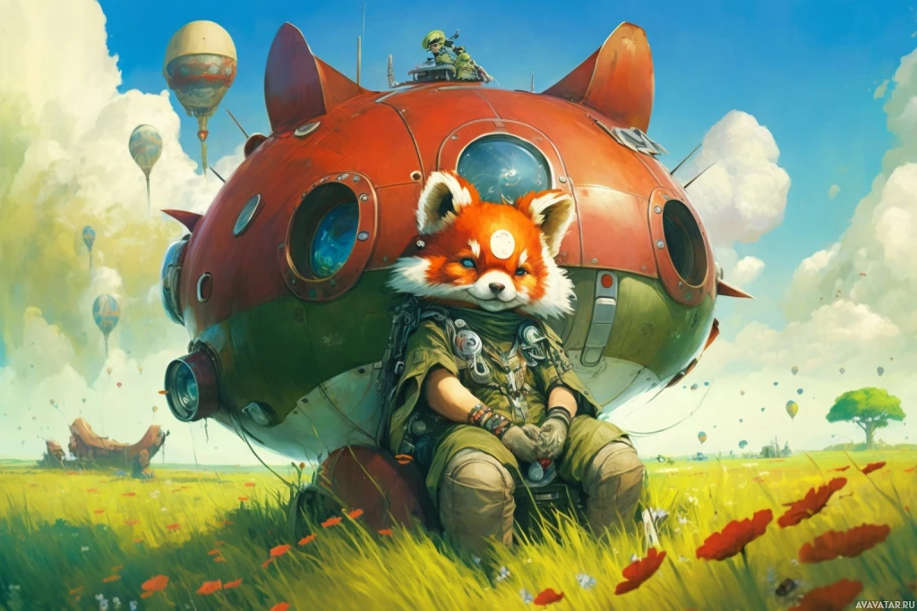 a red panda, anthropomorphized with human-like arms and hands, sitting inside what seems to be an air balloon or dirigible. The character is wearing a helmet and