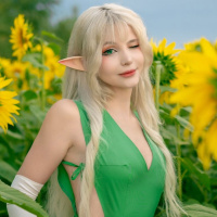 The image shows a person dressed in an elf costume, which is commonly associated with fantasy themes. They are posed outdoors among sunflowers, which adds to the whimsical and playful nature of the photo.