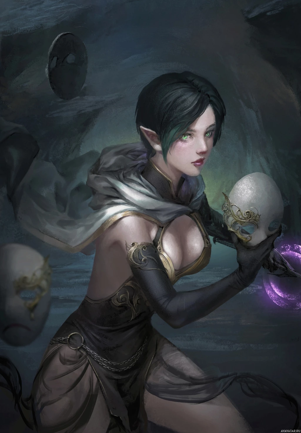an illustrated character who appears to be a fantasy-themed elf. She is wearing dark attire, including what looks like a corset or bodice, and has pointed ears characteristic of elves in