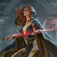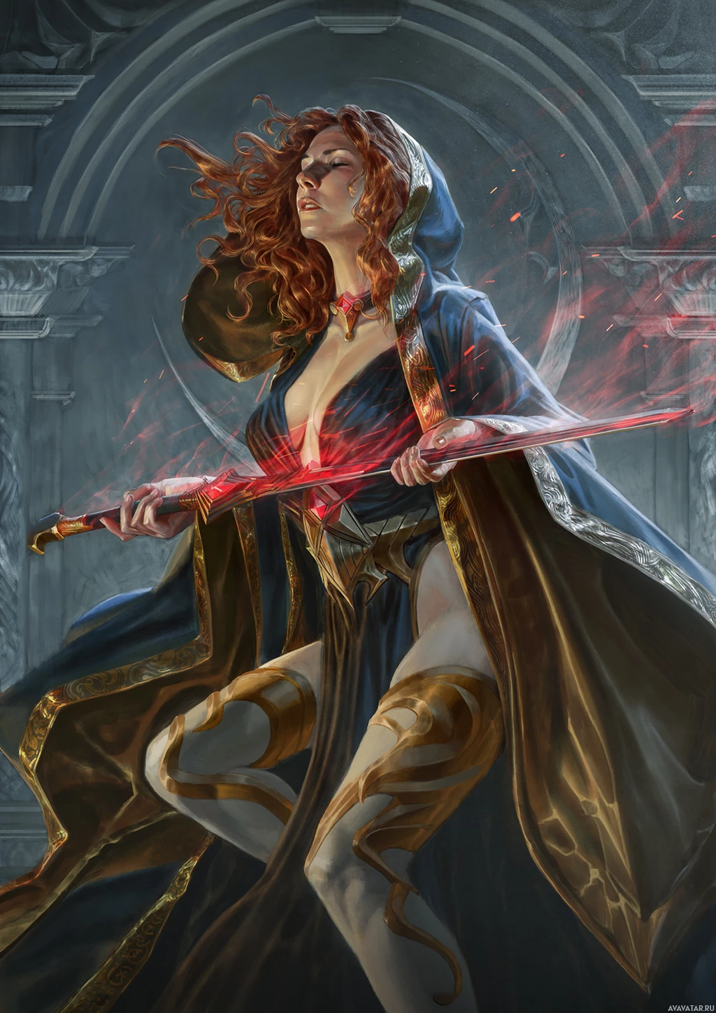 the fantasy genre. This character is a red-haired woman who is holding a sword in her right hand, with her eyes closed as if she's concentrating or perhaps summoning something. She is adorned in