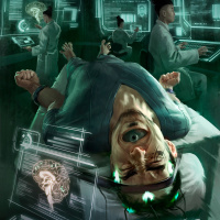 a science fiction or cyberpunk scene with individuals wearing high-tech gear. In the foreground, there is a man lying on his back with his head resting in a device that appears to be