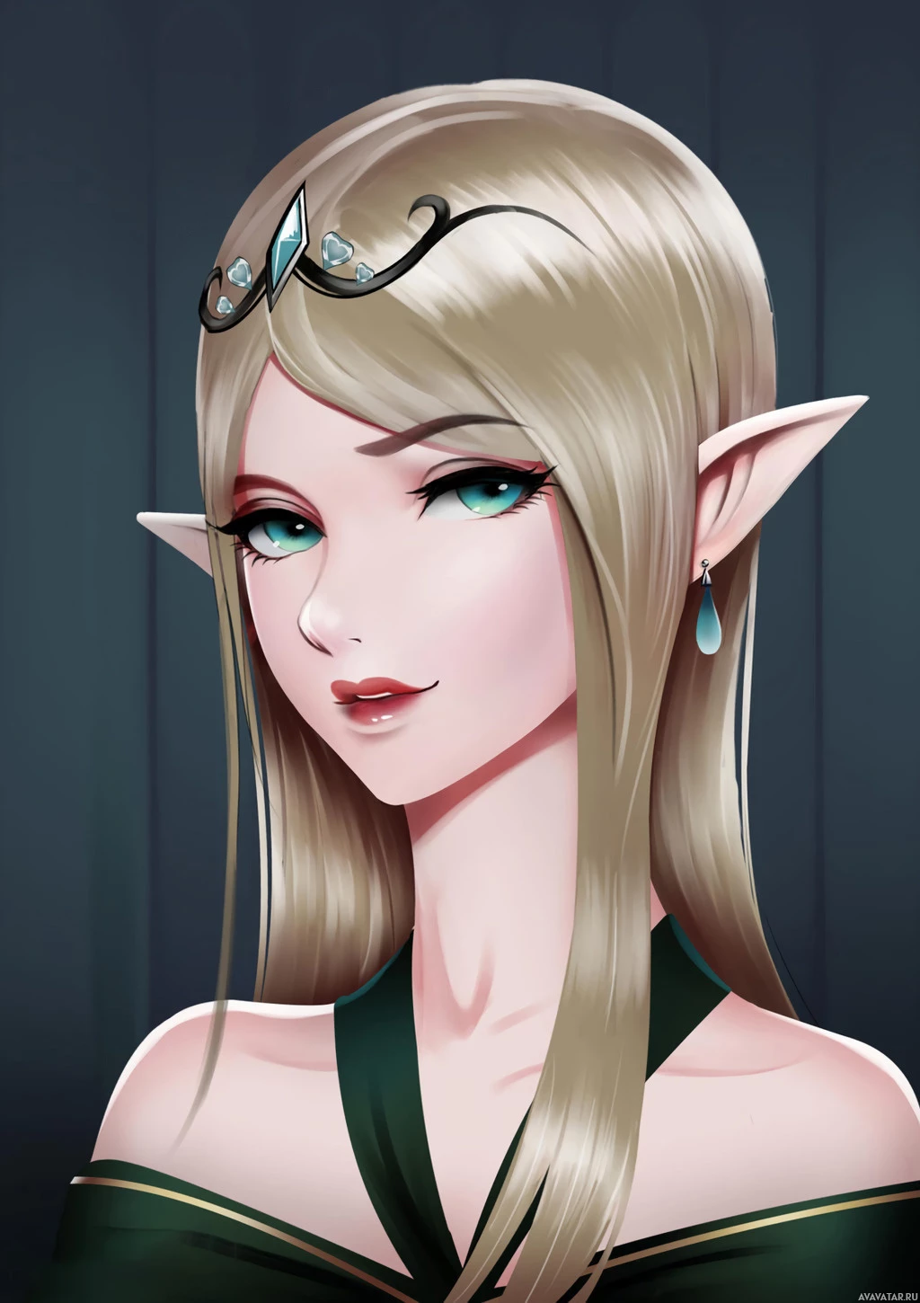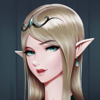 an illustrated character who appears to be a fantasy-style elf. She has long