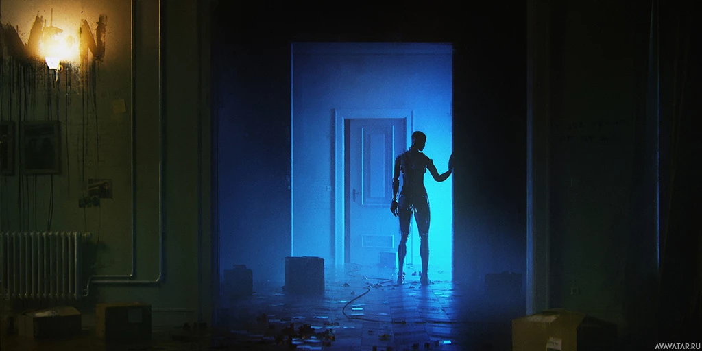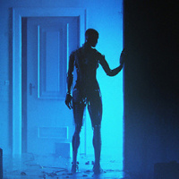 a dark outfit and appears to be looking into a room filled with mist or smoke. There are also some objects that resemble cylindrical containers on the ground. The lighting creates a somewhat