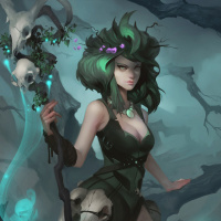 The image features a character that appears to be a witch or sorceress. She has green hair, which is often associated with the theme of nature and magic in
