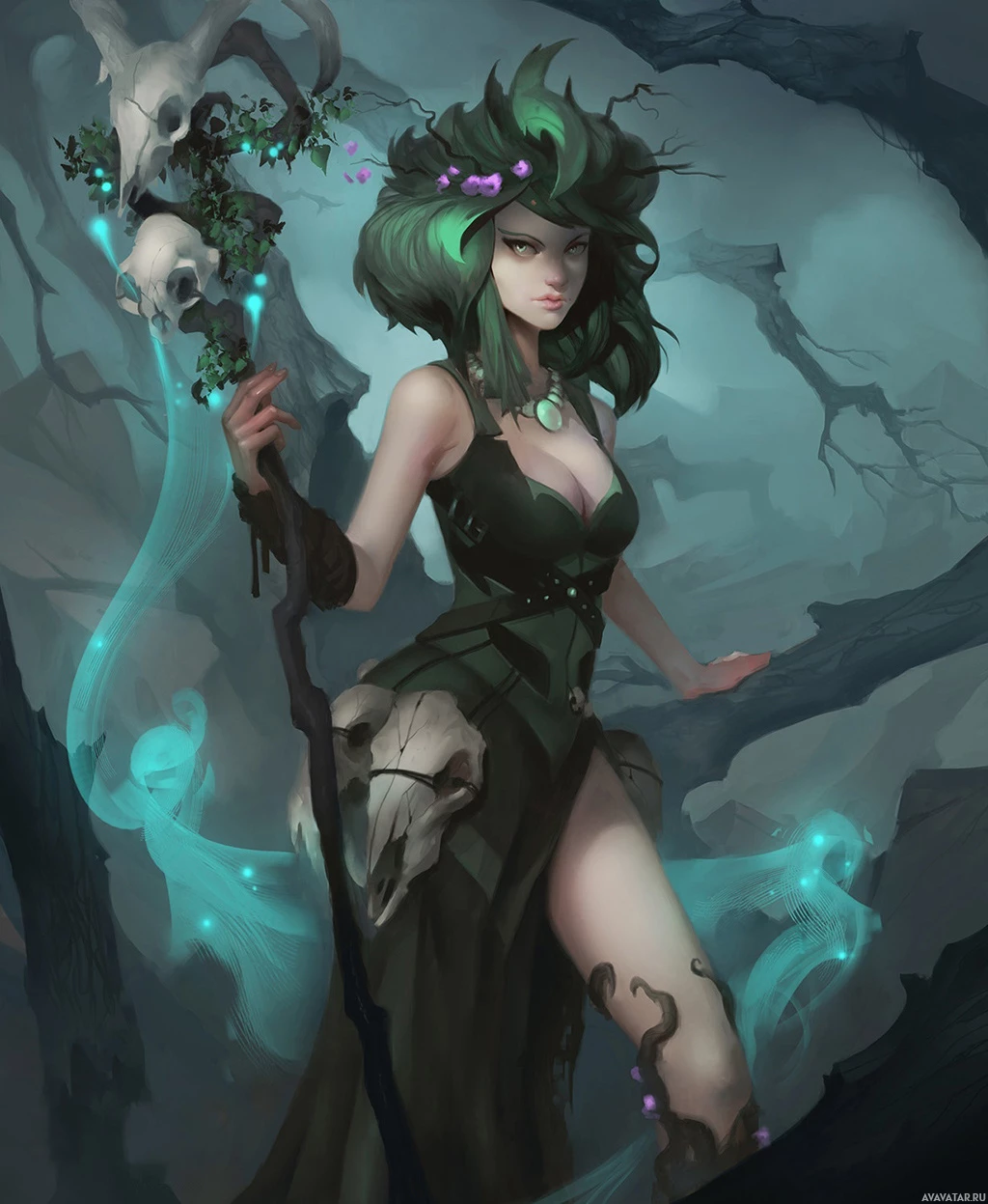fantasy art. Her attire includes a dress with a dark color scheme and what seems to be magical elements or symbols on it. In her left hand, she holds a staff that emits