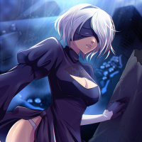 the video game "Nier: Automata." This character is known as YoRHa No.2 Type D, also referred to as 2B or simply as "the android" in-game. She is depicted with mechanical parts and a robotic appearance, dressed in a black dress with a white collar, which contrasts with her