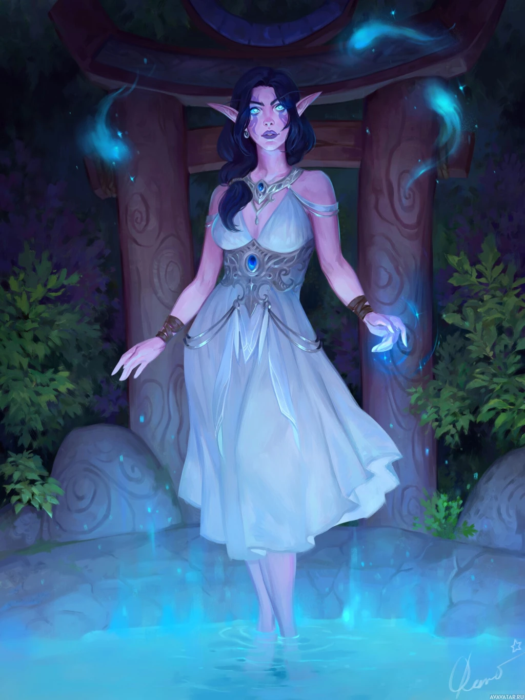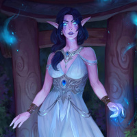 dark hair, pointed ears indicative of an elf or drow (a type of elf in the Warcraft universe), and is wearing an elegant dress with intricate patterns. Her body language suggests grace and control as she reaches out towards her right hand, where blue energy sparks are emanating from her fingers, indicating that she may have