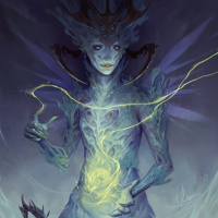 The image depicts a fantasy-themed illustration of an otherworldly creature. It features a humanoid figure with a torch and horns, suggesting a mythical or magical entity. The creature's face has a serene expression as it holds a staff or wand with a light emanating from the top. Its body is intricately designed with various shapes that could be interpreted as elements of nature or symbols often associated with magic or mystical creatures in fantasy art.