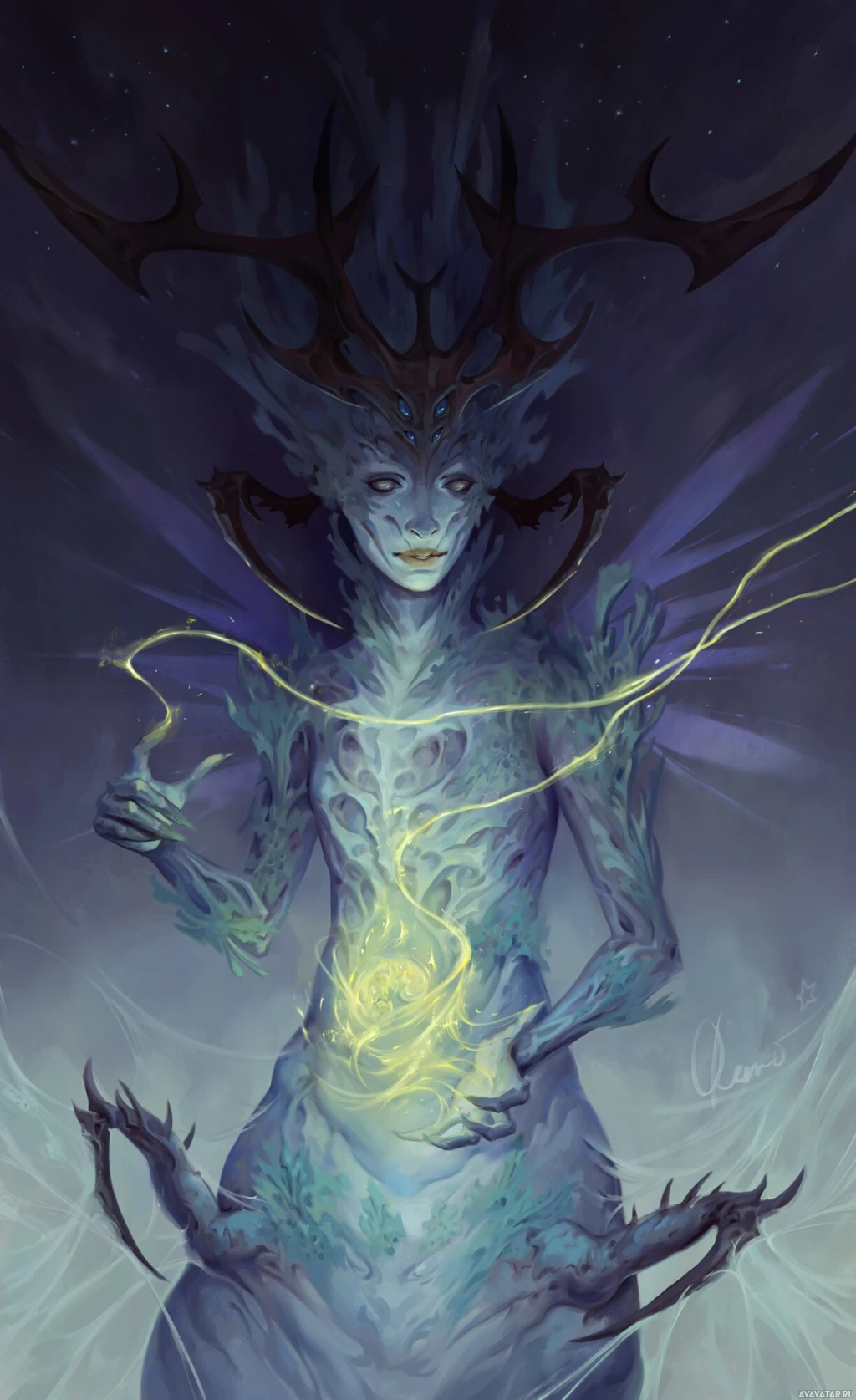 На картинке изображено потустороннее существо в стиле фэнтези. На нем изображена гуманоидная фигура с факелом и рогами, что наводит на мысль о мифическом или магическом существе. Лицо существа безмятежно, оно держит посох или волшебную палочку, из навершия которой исходит свет. Его корпус замысловато оформлен различными формами, которые могут быть интерпретированы как элементы природы или символы, часто ассоциирующиеся с магией или мистическими существами в фэнтезийном искусстве.