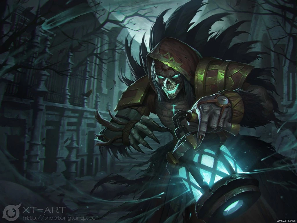 a dark forest or area with trees and a gothic atmosphere that is fitting for this character's theme within the "League of Legends" universe.