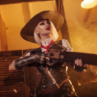 the video game Overwatch. The individual is wearing a cowboy-style outfit with a wide-