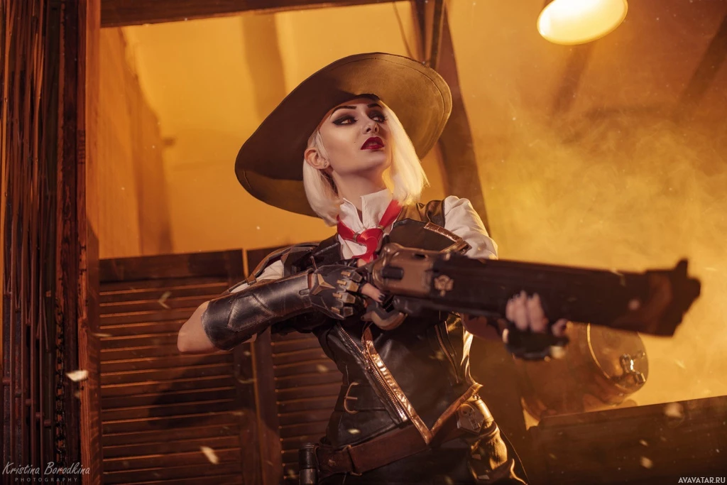 In the image, there is a person cosplaying as Ashe, a character from