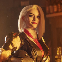 silver hair. The individual is standing behind what appears to be a bar counter or a similar setting, suggesting