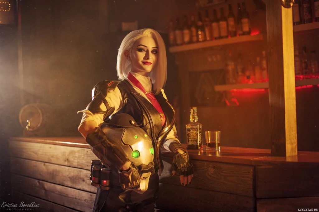 the video game "Overwatch." They are wearing a costume that includes armor, a futuristic pistol with a targeting scope, and have short