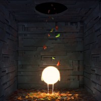 colorful leaves are scattered, suggesting they have been blown into the space by wind through an opening or vent near the ceiling. The overall atmosphere of the image is dimly lit and somewhat mysterious due to
