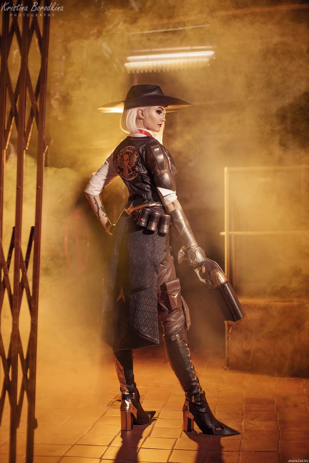 trench coat, and the armor worn by Ashe in the game. The setting appears to be a stylized environment that could be part of the game's theme, with the use of lighting and smoke effects adding to