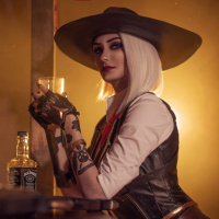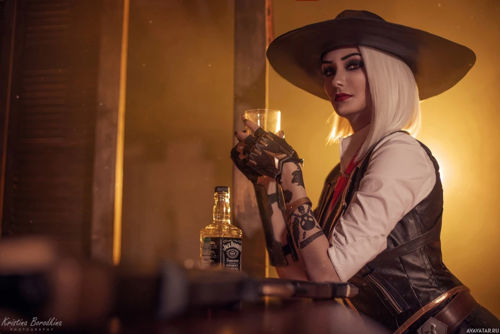 The image features a person wearing a costume that resembles the character Ashe from