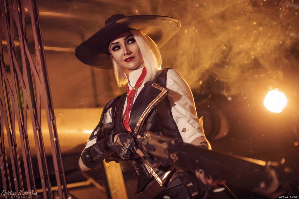 На картинке изображен человек в костюме для косплея. Он одет как Эш, персонаж видеоигры "Overwatch". Костюм включает в себя темную ковбойскую шляпу и одежду, напоминающую рубашку в западном стиле с красной лентой, повязанной вокруг талии. Обстановка выглядит как индустриальная или постапокалиптическая, с дымом или паром на заднем плане и искусственным освещением, выделяющим фигуру.