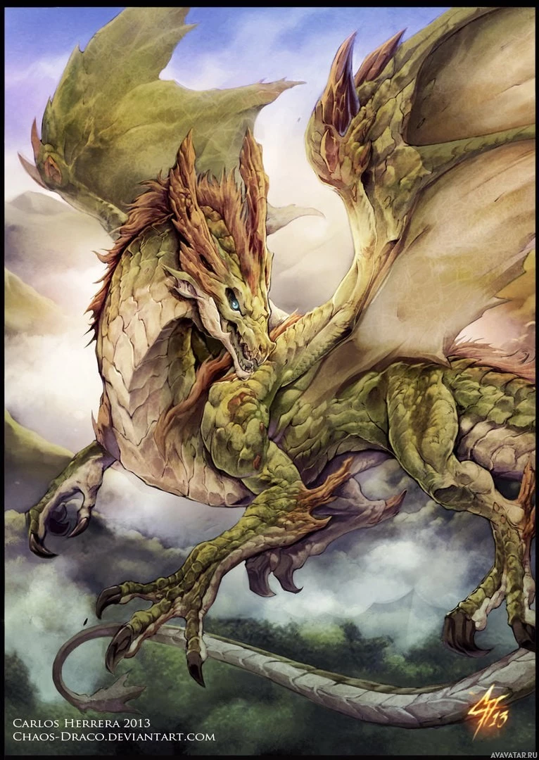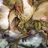 a serpentine body with scales, wings, and a head that resembles that of a bird or raptor. The dragon is depicted in mid-flight against