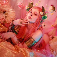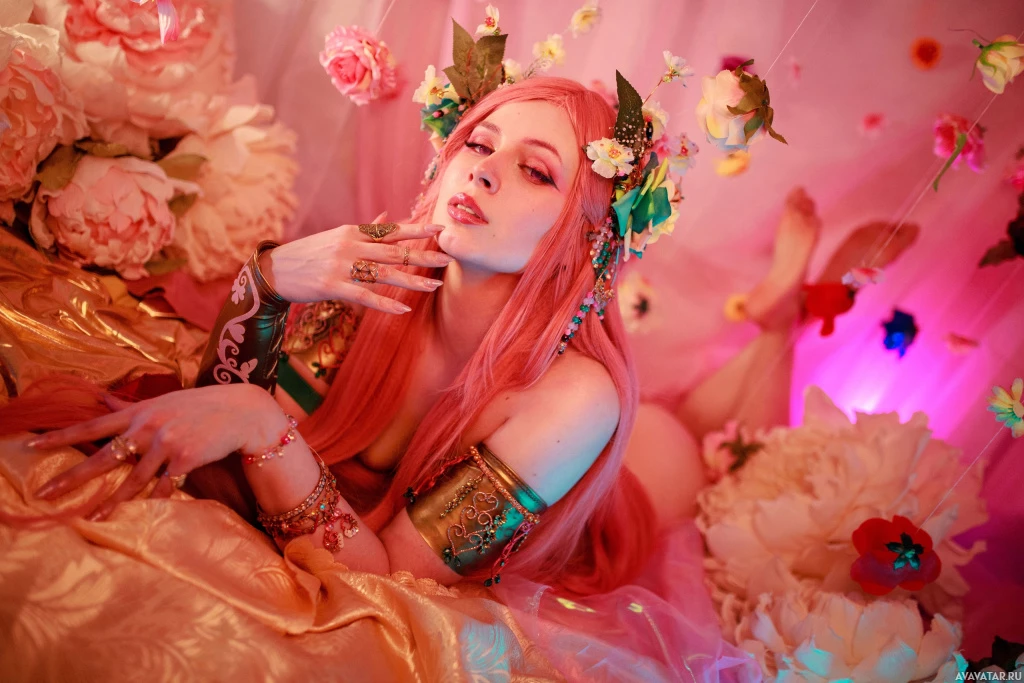 pink hair lying on their stomach. They have an intricate floral headpiece and are wearing a costume that includes golden armor-like accents, which suggests they might be in character or participating in some form of