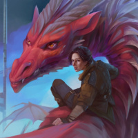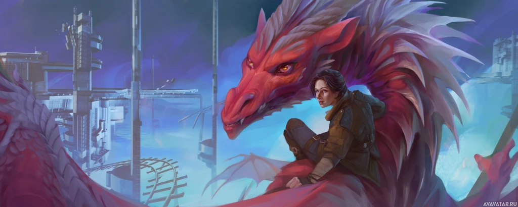 a red dragon that has prominent wings and a fierce expression. The background suggests a setting with industrial elements, possibly suggesting a fusion of fantasy and science fiction elements in this artwork.
