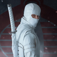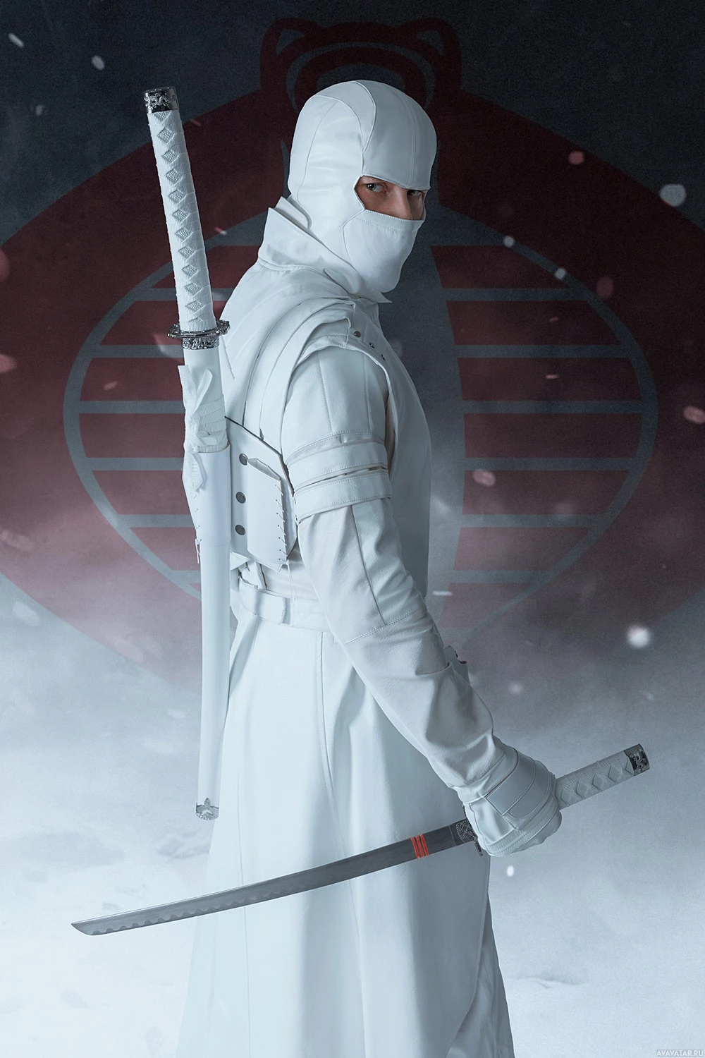 a ninja costume, complete with a mask and holding a sword. They are standing against a backdrop that appears to be a winter setting with snowflakes falling and red and white banners hanging on the wall behind them. There's also a red circle with what seems to be