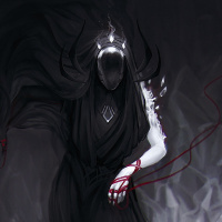 ominous atmosphere, featuring a figure draped in dark robes and adorned with what looks like skulls or bones as part of the attire. The character's posture and expression suggest a sense of power or menace, and there are hints of magical elements like the glowing