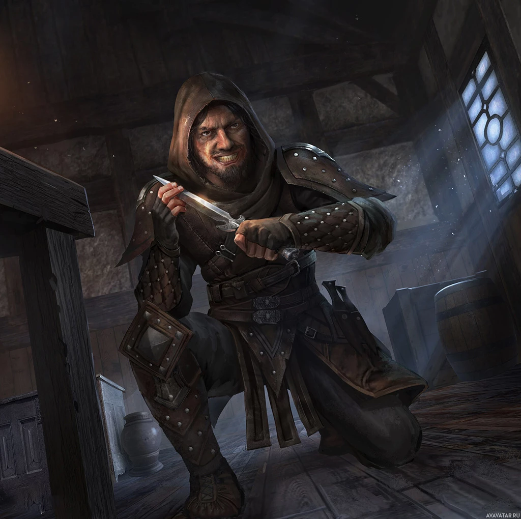 fantasy attire. He has a beard and mustache, which contribute to a rugged appearance. The man is holding two knives close to each other in his hands, possibly sharpening them on a stone or preparing for some