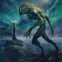 green eyes and a somewhat menacing expression. It's important to note that this image is likely part of a fantasy-themed artwork or illustration rather than a depiction of real life events or places.