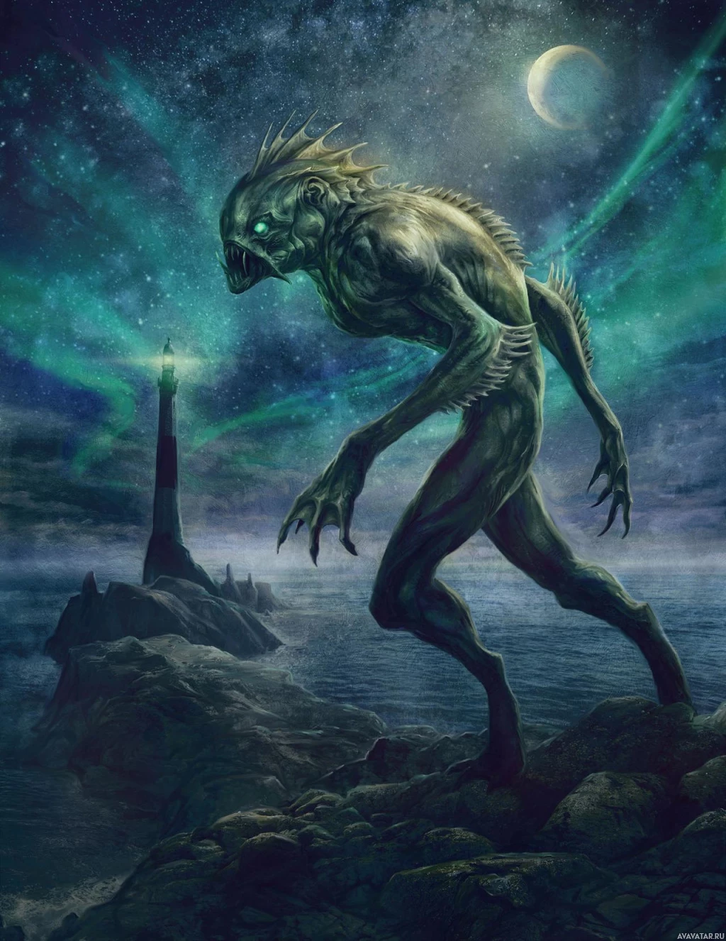 horror scene. It features a humanoid creature with an amphibious appearance, resembling