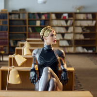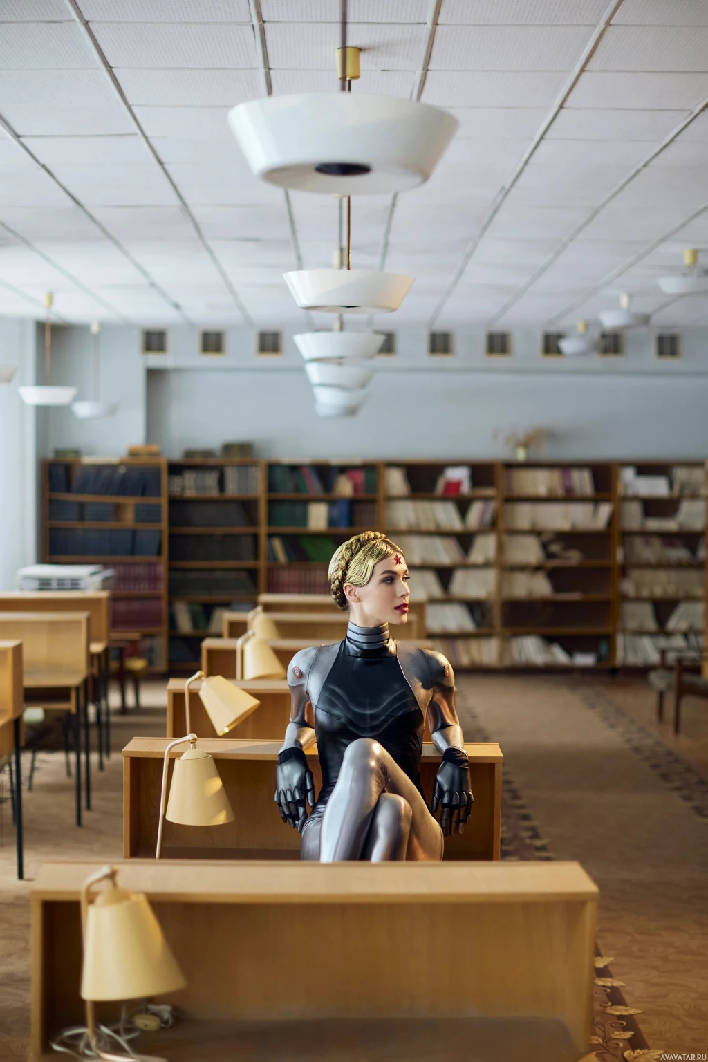 an indoor environment, possibly a library or study area, given the presence of bookshelves and desks in the background. The person is wearing a mask that matches their attire, adding to the character-like appearance. The overall atmosphere suggests a blend of everyday life with elements inspired by the fantasy aspects of