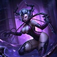 На этом изображении изображен персонаж из видеоигры «Лига легенд». Она - воин или маг в жанре фэнтези, о чем свидетельствуют ее наряд и магические лезвия, которые она держит. Стиль произведения искусства соответствует визуальной эстетике, используемой в игре для ее персонажей.