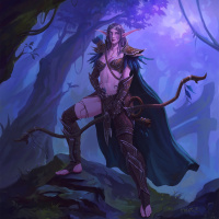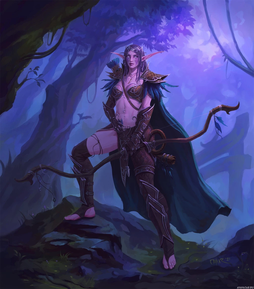 a drow elf, which is a race known for their dark skin and pointy ears in the Warcraft lore. The character is depicted with