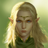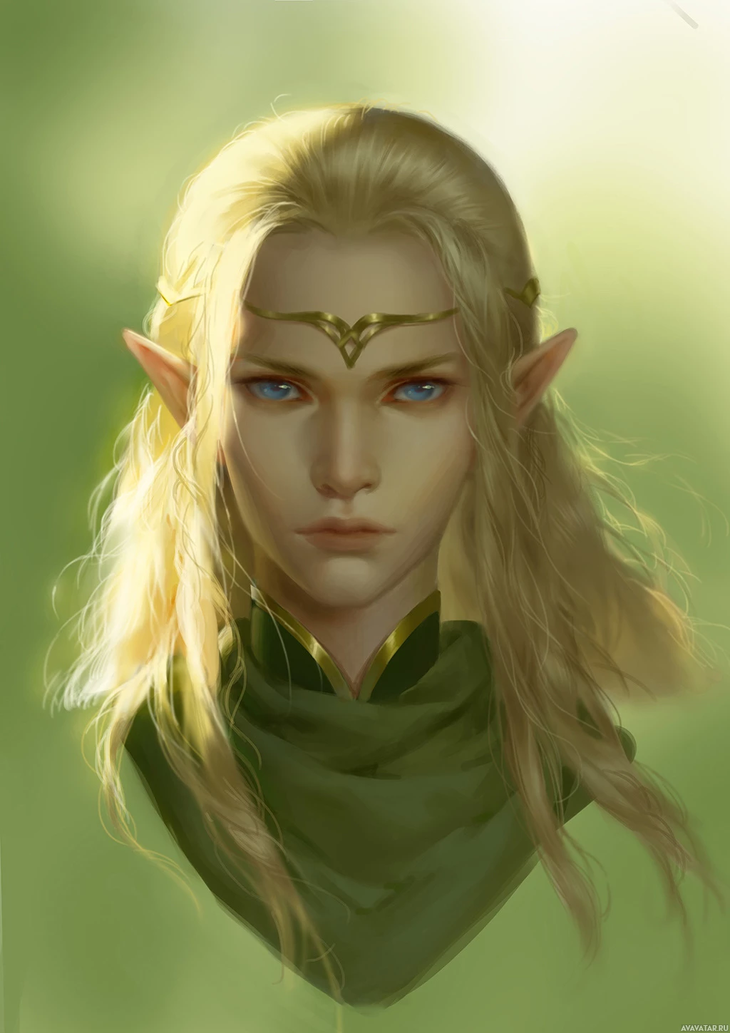 blonde hair and pointed ears typical of elves in various mythologies and fictional works. They are wearing what appears to be green and gold armor, with