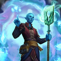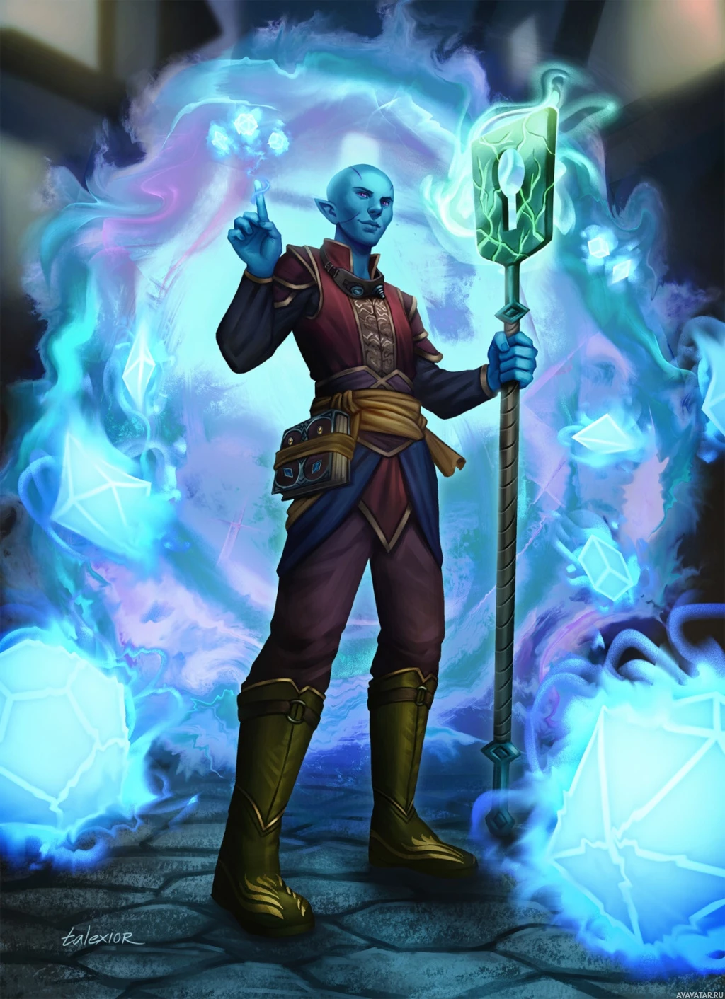 a fantasy character that appears to be a mage. The character is depicted with a blue skin tone and has a staff in one hand and a book or tome in the other, suggesting